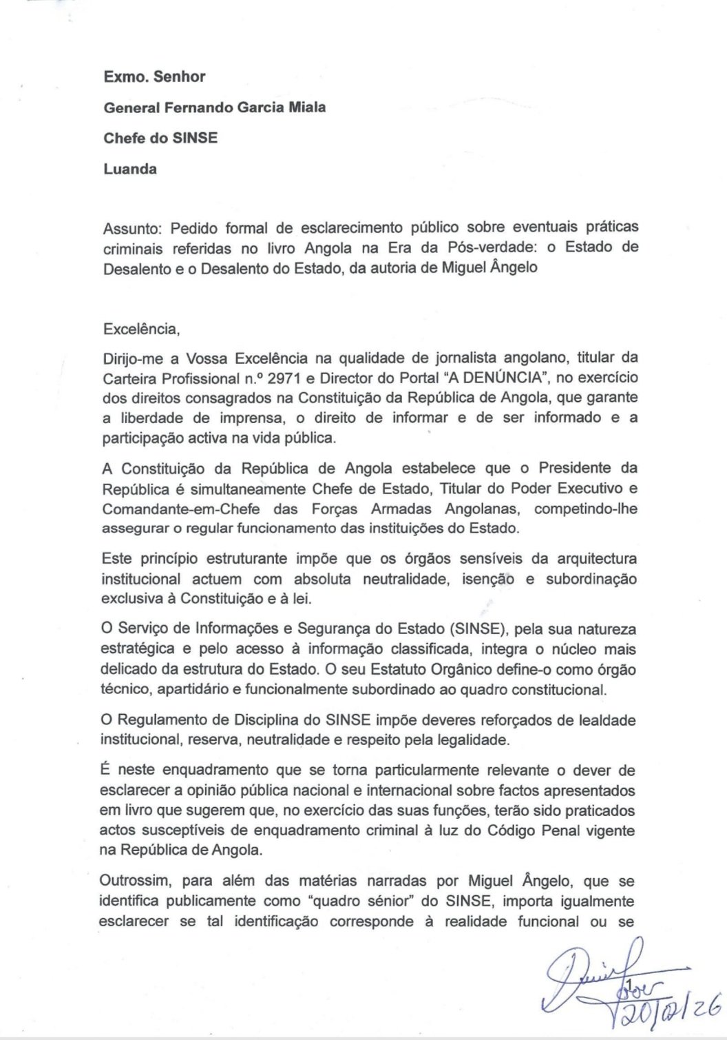 O jornalista e director do Portal “A DENÚNCIA”, Carlos Alberto, titular da Carteira Profissional n.º 2971, deu entrada formal, esta sexta-feira, 20 de Fevereiro de 2026, de um pedido de esclarecimento público dirigido ao chefe do Serviço de Informações e Segurança do Estado (SINSE), general Fernando Garcia Miala.